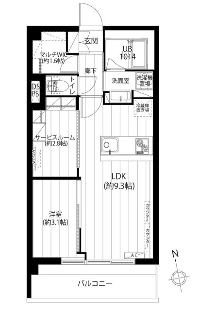 南向きバルコニーに面した明るいお部屋です。縦長でキッチン、ダイニング、リビングと並んだオーソドックスなタイプ。レイアウトに悩むことはなさそうですね。本来、広さ的にダイニングとリビングの両立は難しいのですが、キッチンカウンターのように置かれたコンパクトなテーブルがその問題を解決してくれています。(スミマセン、この写真ではわかりづらいので後の写真を参考にしてください(^-^;)