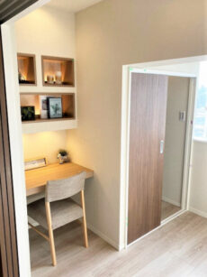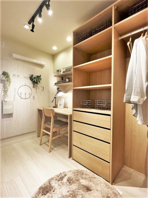デスクや棚、オープンクローゼットなどが造り付けになったお部屋です。書斎として在宅ワークに使ったり、趣味を楽しむ城を築いたり、ライフスタイルによって自由に使っていただけます。ただし、ガラス張りなので物置にならないよう気を付けましょう!