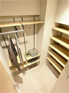玄関を入って左側にシューズボックス、右側には洗濯機スペースが設けられています。シューズボックスは収納力のあるトールタイプ。棚の高さが調節可能なのでブーツやヒールなど背の高い靴でもきれいに収納できますよ。玄関から伸びる廊下には調理台が置かれキッチンスペースを兼ねています。