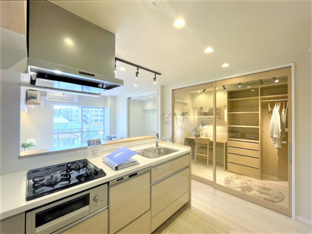 調理台には建具とコーディネートされた木目パネルを使用。廊下にあるというと狭くて簡易的なキッチンのイメージですが、作業スペースもしっかり確保さた使いやすそうなキッチンです。専用スペースがあるので大きな冷蔵庫も置けますし、食器洗浄乾燥機や浄水機能一体型水栓などの便利機能も充実していますよ。
