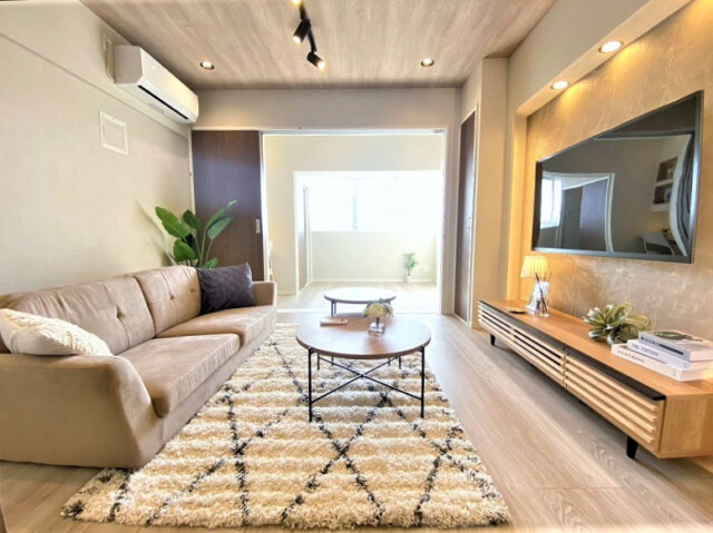 付加された壁に付けられた間接照明や飾り棚など内装にもこだわりを感じます。壁に絵を飾るってなかなかハードルが高いと思いませんか?棚に洒落た小物を置くだけなら気軽にインテリアを楽しめますからね。小物は別ですが、家具・エアコン付きなのでこのままのイメージで生活をスタートさせることが出来ますよ。