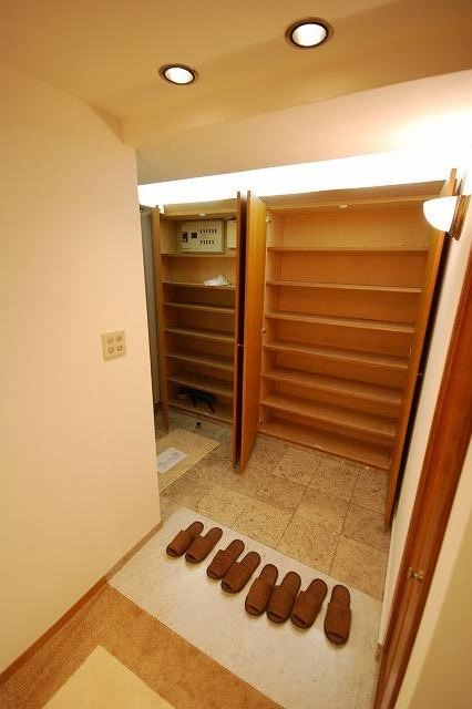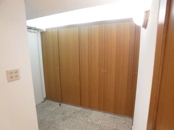 エレベーターホールを出ると、迷うことなく玄関が目の前にあります。そりゃそうです。ワンフロアに1戸しかないんですもの。と思ったら、ドアがふたつ・・・。あれれ??と思いましたが、間取りをみて納得(*^^)vお勝手口があるんですねっ!!