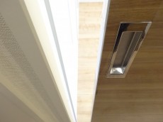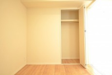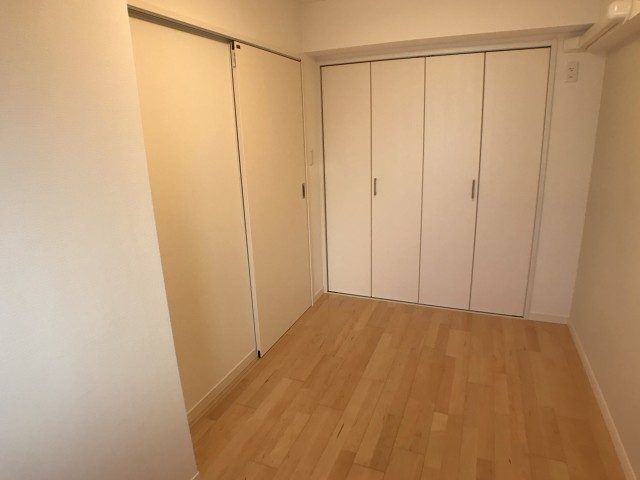 窓の外は明るい外廊下。ここでもくもりガラスの衝立が役に立ってくれていますね。しっかり面格子も設置されていますよ。クローゼットは南西側の洋室と同タイプ。