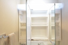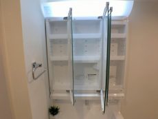 洗面台は身だしなみチェックに便利な三面鏡付き。上部に付けられた照明のおかげで鏡を見る時に影になったりする事もありません。