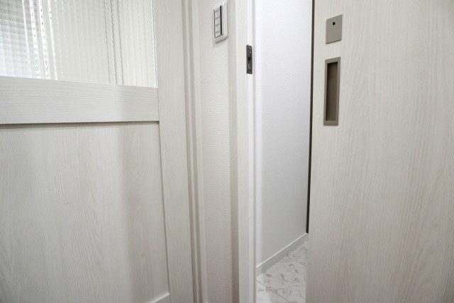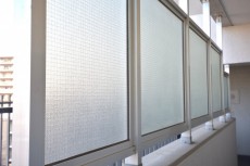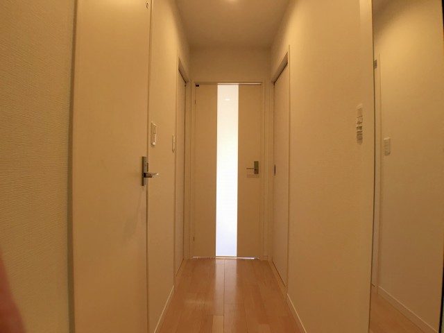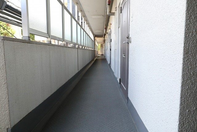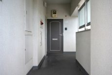 エレベーターで6階まで上がり、明るい外廊下を進むとお部屋に到着です。外廊下はくもりガラスで目隠しされているので、外からの目も気になりませんよ。
