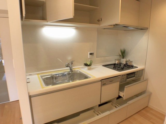 調理台の下には食器洗浄乾燥機とスライドキャビネット。食洗機、いいですね~!これからの寒さと乾燥の季節、食器洗いしなくてもいいなんて夢のようです。食後をのんびり過ごせるのも最高ですよね♬