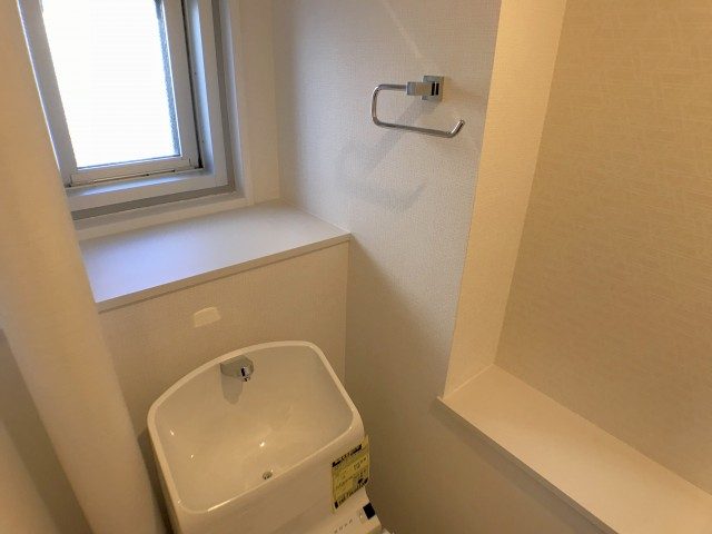ウォシュレットと後ろに窓と棚があります。自然換気ができるのがうれしいですね。