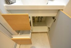 収納は洗面台下のスライドキャビネットと三面鏡裏のキャビネット。細々した物が多くなりがちな洗面廻りには豊富な収納が嬉しいですね。タイプの違う収納で大きな物から細かい物までバランスよく収まりそうです。