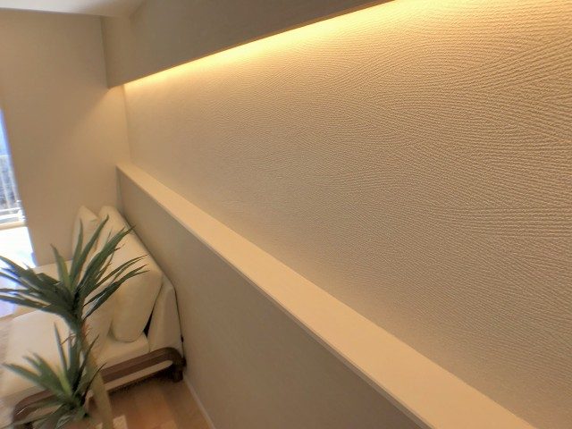 窓側からもご覧ください。壁面はアクセントクロスが使われ、LDKをおしゃれに演出しています。