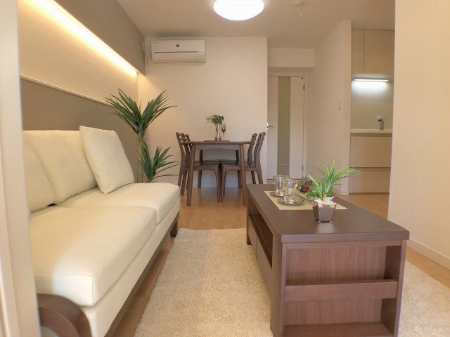 南東向きの明るいLDK。家具が置いてあるので実際の生活イメージもわきやすいのではないでしょうか?エアコンも設置済みです。