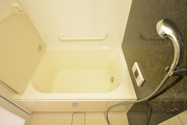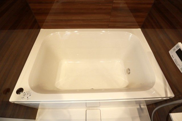 追い焚きと浴室換気乾燥機能付きのバスルーム。