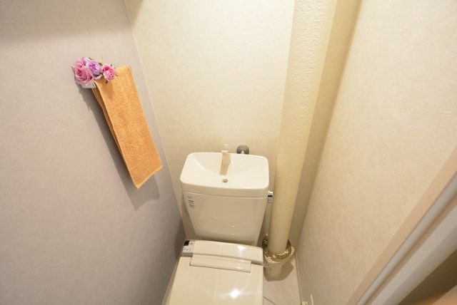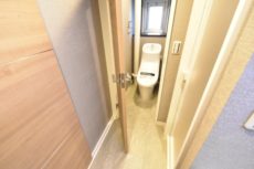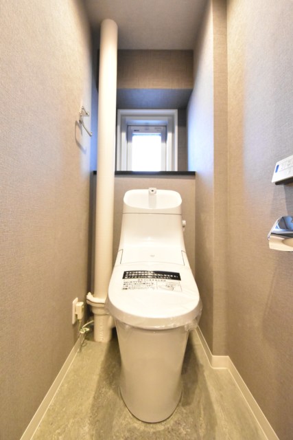 廊下を進んですぐ左側の扉はトイレ。ウォシュレットと収納、窓がついています。窓の手前ある白い筒は配管です。見慣れれば特に問題はないかと・・・。