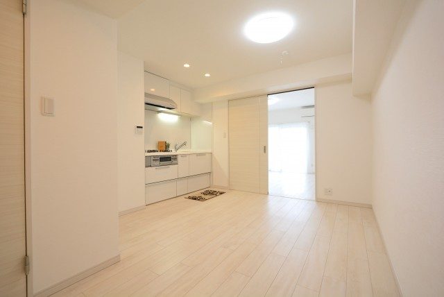 こちらは約13.7帖のリビング・ダイニング・キッチン。南西向きのバルコニーに面したとても明るいお部屋です。形はL字型。キッチンが奥まった所にあるので、残りの四角いスペースをリビングダイニングに使うことが出来ます。
