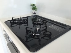コンロは3口魚焼きグリル付。左右のコンロは温度設定ができるタイプなので、揚げ物や炊飯時にとても便利です。