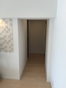 リビングダイニングキッチン入ってすぐ右手に廊下があります。廊下右手と左手に洋室は一つずつ。梁があって、天井が低くなっています。約180cmの高さ、背の高い方は頭上注意です。
