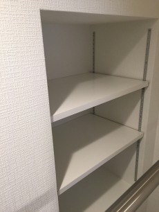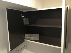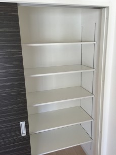 右手の扉には可動式の棚が設置されていて小さい物の収納はこちらにお任せ