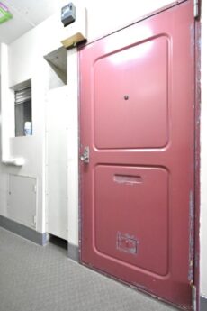 お部屋の玄関前にきました。玄関扉からは建物に刻まれた歴史を感じさせられる反面、モニター付きインターホンが設置されていました!来訪者が「ピンポーン」と押しても、お部屋の中で誰なのか確認したのちに、応対するかどうか判断できます。安心の設備ですね!!