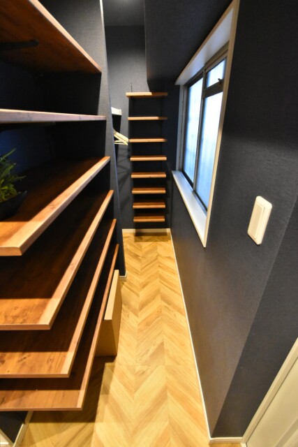 廊下の突き当りの扉が、シューズインクローゼット♫間口はあまり広くありませんが、奥行きは約85cm!通常の棚が2つ分の奥行きという面白い造り。普段あまり使わない靴やオフシーズンの靴は箱にしまって奥の方へ♫工夫次第で可能性は膨らみます
