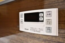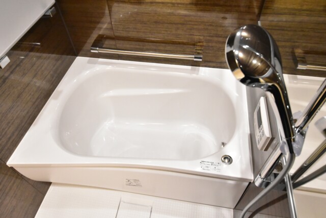 バスルームは、ホワイトの木調パネルで清潔感のある空間です。バスタブも大きめサイズです。追炊き機能付きなので、いつでも温かい湯船に浸かれるのは嬉しいですね。