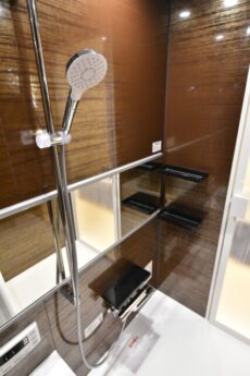 洗面化粧台の向かい側は浴室です。浴室は何やらきらびやかなパネルで気分が上がりそうです![]()