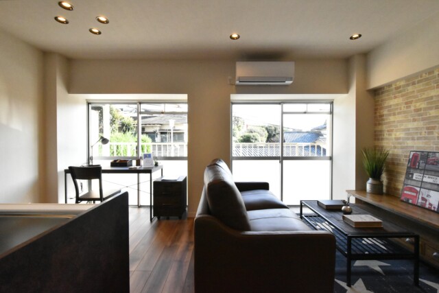 この空間にはレザーの黒やこげ茶のソファが合いそうです。