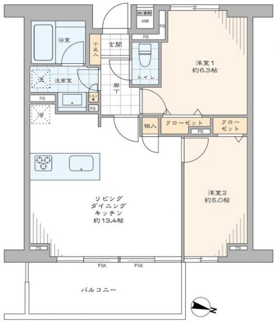南西向きバルコニーに面した明るいお部屋です。リビングダイニング部分の幅が広くなっているので、数字以上に広々と感じますよ。