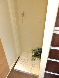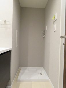 洗面台の左側に洗濯機置場があります。その隣にはリネン庫があるので、お掃除道具や洗濯用具、バスタオルまで、色々と収納できるのが嬉しいですね☆
