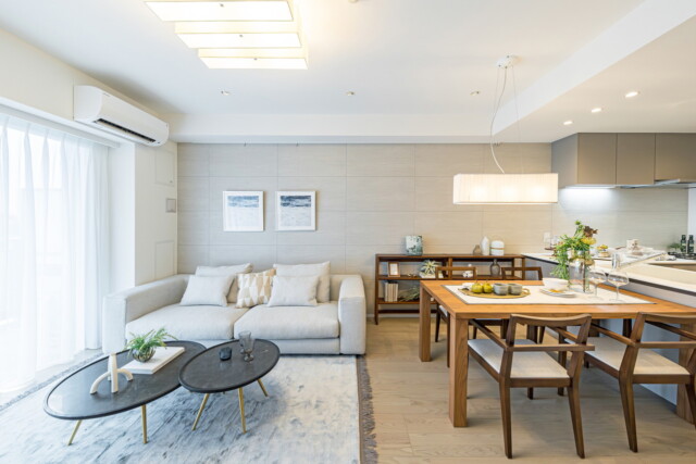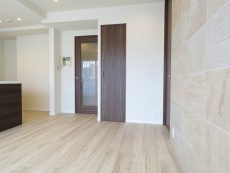ナチュラルなフローリングと白のクロスに、ストーン調タイルのアクセントが良く合っていますね。ちなみに家具はディスプレイ用なので付いてきません。木製の家具を増やせばナチュラル寄りに、モノトーンやアイアン素材などでコーディネートすればモダンやインダストリアルテイストなどご自身でお好みの雰囲気の空間を創ることが出来ます。