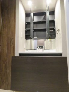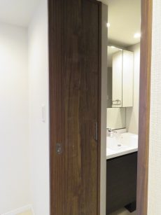 LIXIL製の洗面化粧台。建具と同じ色合いで統一感があっていいですね。