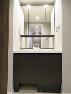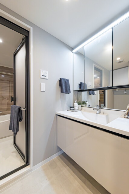 洗面室には洗面化粧台の他に洗濯機スペースと浴室がまとまっていて脱衣室も兼ねています。洗面化粧台は身だしなみを整えるのに便利な三面鏡付き。裏がキャビネットになっているので、洗面周りに散らかりがちな細々したものもスッキリと片付けることが可能です。小さなお子様でも使いやすいミドルミラー付き。