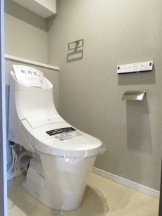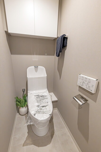 トイレはTOTO製の洗浄機能一体型。トイレットペーパーや掃除道具の収納に便利な吊り戸棚も付いています。