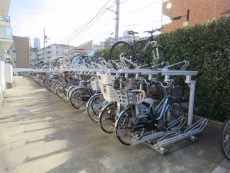 マンション裏手には駐輪場とバイク置場がありました。駐車場はエントランス側にあります。