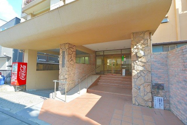 こちらがマンションのエントランスです。向かって左がスロープになっていて地下1階の駐車場へと続きます。エントランス前の階段は横にスロープがありベビーカーでも楽に登れます◎
