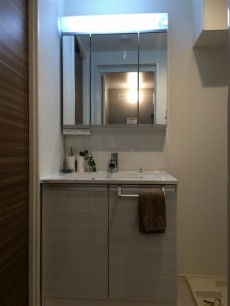 収納は三面鏡裏のキャビネット、洗面台下、リネン庫。いろいろなタイプの収納があっていいですね。タオルなど、使う所に収納出来るのはほんとに便利です。