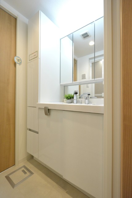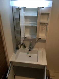洗面台は三面鏡付き。白一色で清潔感がありますね。