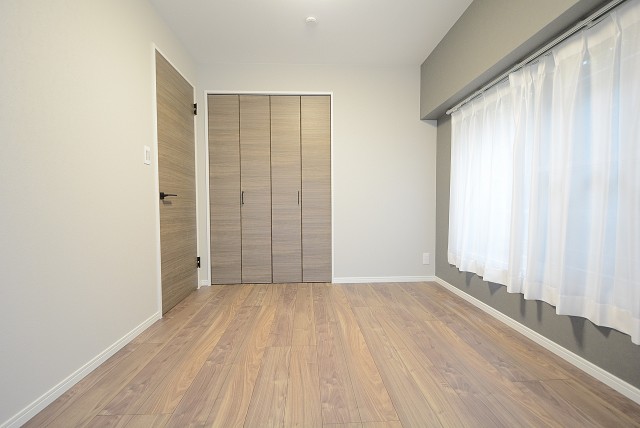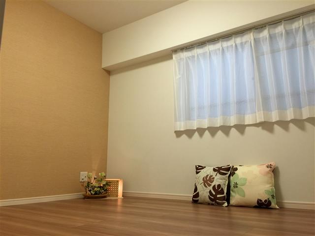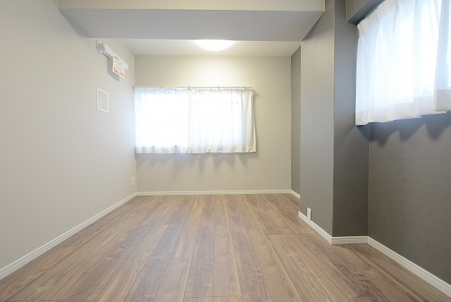 さすがの角部屋でこちらのお部屋にも窓があります。向きは西向き♫南側の壁が暖色系のアクセントクロス。こちらのお部屋にクローゼットはありません。