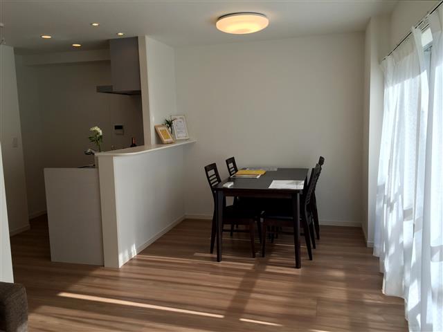 それでは廊下突き当りのリビングダイニングキッチンを見ていきましょう♪♪扉を開けるとお部屋は右に左に広がっています♪♪正面の南向きの窓からの日差しで明るさ充分な暖かいお部屋です。