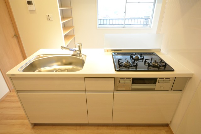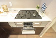 コンロは3口のグリル付きガスコンロ。片面焼きのグリルですが、上手に使えばトーストからグラタンまでお料理の幅が広がります。