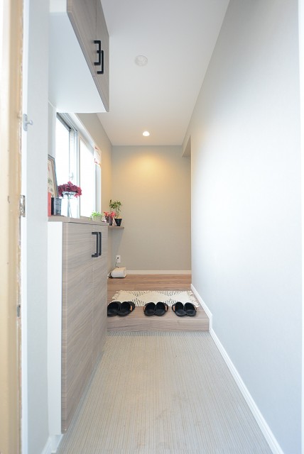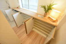 廊下の幅いっぱいを使ったカウンタータイプのシューズボックス。抜群の収納力はもちろんの事、カウンターにはいろいろ飾ってお洒落に玄関を演出出来ます。「玄関はお部屋の顏」って言いますからね(^^)
