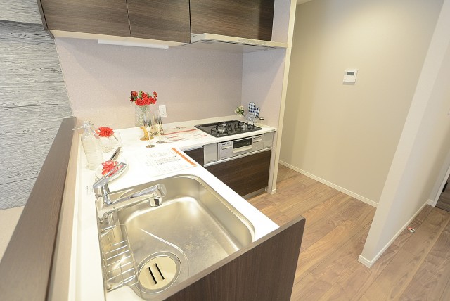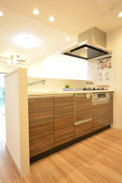 木目パネルを使った調理台はお部屋の雰囲気にピッタリです。