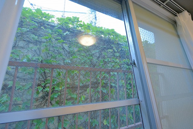 東側の窓を開けるとすぐ隣の建物の壁になっていました。日射しは期待出来ませんが、風通しには役立ちそうです。無味乾燥な壁ではなく蔦がからまっているのが救いですね。サッシは二重。