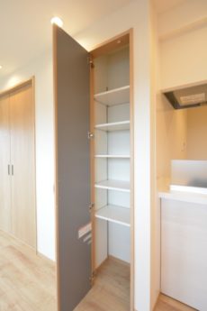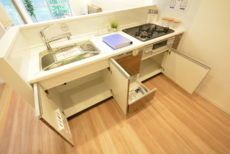 シンクとコンロの下が収納になっています。少し収納が少ないですが、壁側にゆとりがありますので大丈夫です (●´∀`)