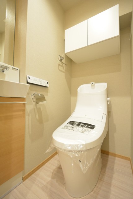 もちろん温水洗浄便座付き。INAX製のシャワートイレです。吊戸棚も付いていてトイレで使う物をストックしておけます。ほんと助かりますよね、外に取りに行けない事もありますから^^;)