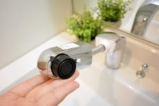 水栓は浄水機能付きです。シャワーヘッドになっているのでシンクの隅々まで水を流すことが可能です。