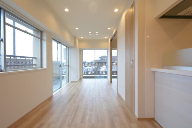 こちらは約11.3帖のリビング・ダイニング・キッチン。手前からキッチン、ダイニング、リビングと並ぶ縦長のお部屋です。オーソドックスで使い分けし易いタイプですね。