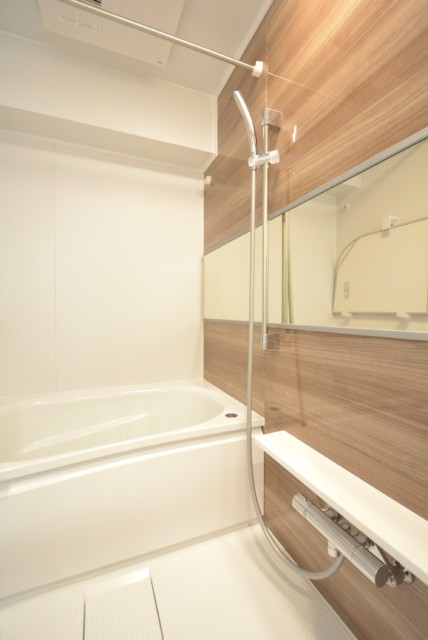 バスルームは、やさしい風合いの木調のパネル☆ゆっくり大きなバスタブにつかって疲れを癒せそうです♪♪追い焚き機能付きでいつでも暖かいお風呂に入れます。
