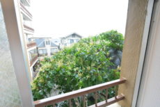 東の窓ですがお隣のマンションが建っているため、朝日は見えなさそうな雰囲気です。。。ツタがはえてるのでマイナスイオンに期待しましょう。