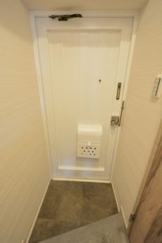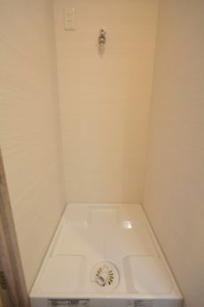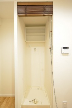お部屋の入口付近には洗濯機スペースがありました。洗面室にある事が多いですが、こちらの方が近くて便利ですね。扉が付いていますので、見た目も問題ありませんよ。