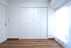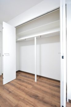 収納は間口が広くて使いやすそうなクローゼット。幅、奥行き共に広くて収納力も十分です。スーツケースなどの嵩張る物も難なく置けますし、衣装ケースなどで収納力アップも良さそうです。