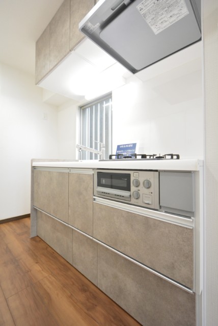 キッチン設備は3口ガスコンロ、グリル、浄水器一体型水栓など充実しています。